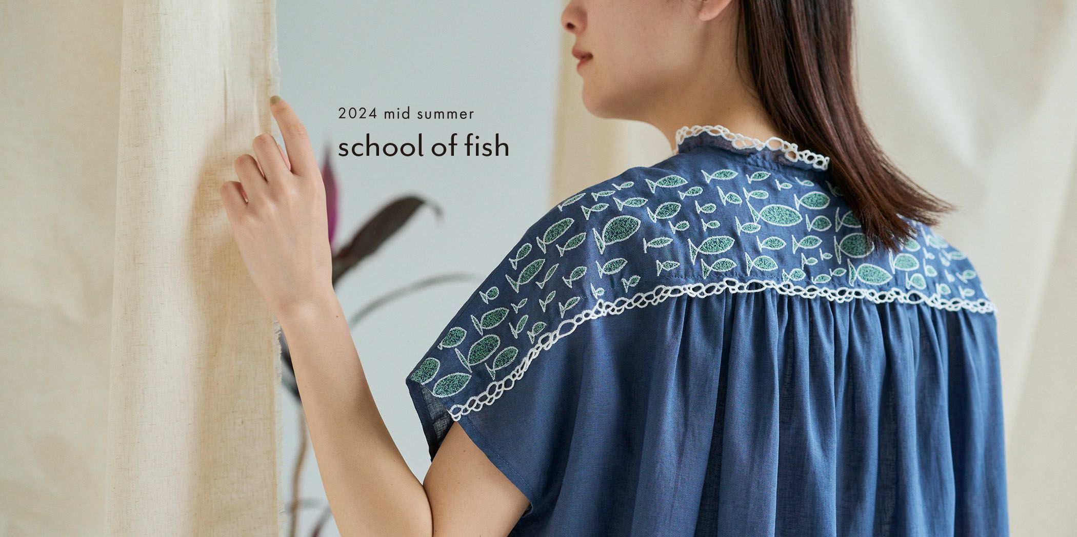 小さな頃に読んだお魚の絵本みたいに、小さな魚たちがあつまって1匹の大きな魚になったようなテキスタイル。支え合って生きる魚の群れを、繊細な刺繍と泡モチーフのレースを使って表現しています。 読みもの"テキスタイル「school of fish」の世界"はこちら