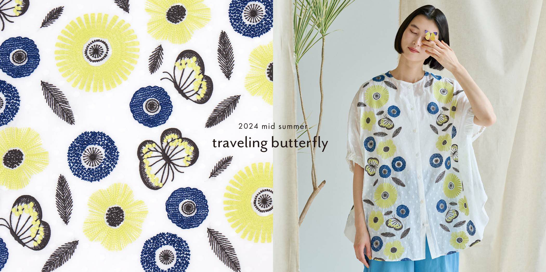 “渡り蝶”とも呼ばれているアサギマダラは、海を超えて1000km以上も旅をします。 そんな蝶たちが長い旅の途中で出会った色とりどりのお花を、華やかでインパクトのある刺繍で描いたテキスタイル。