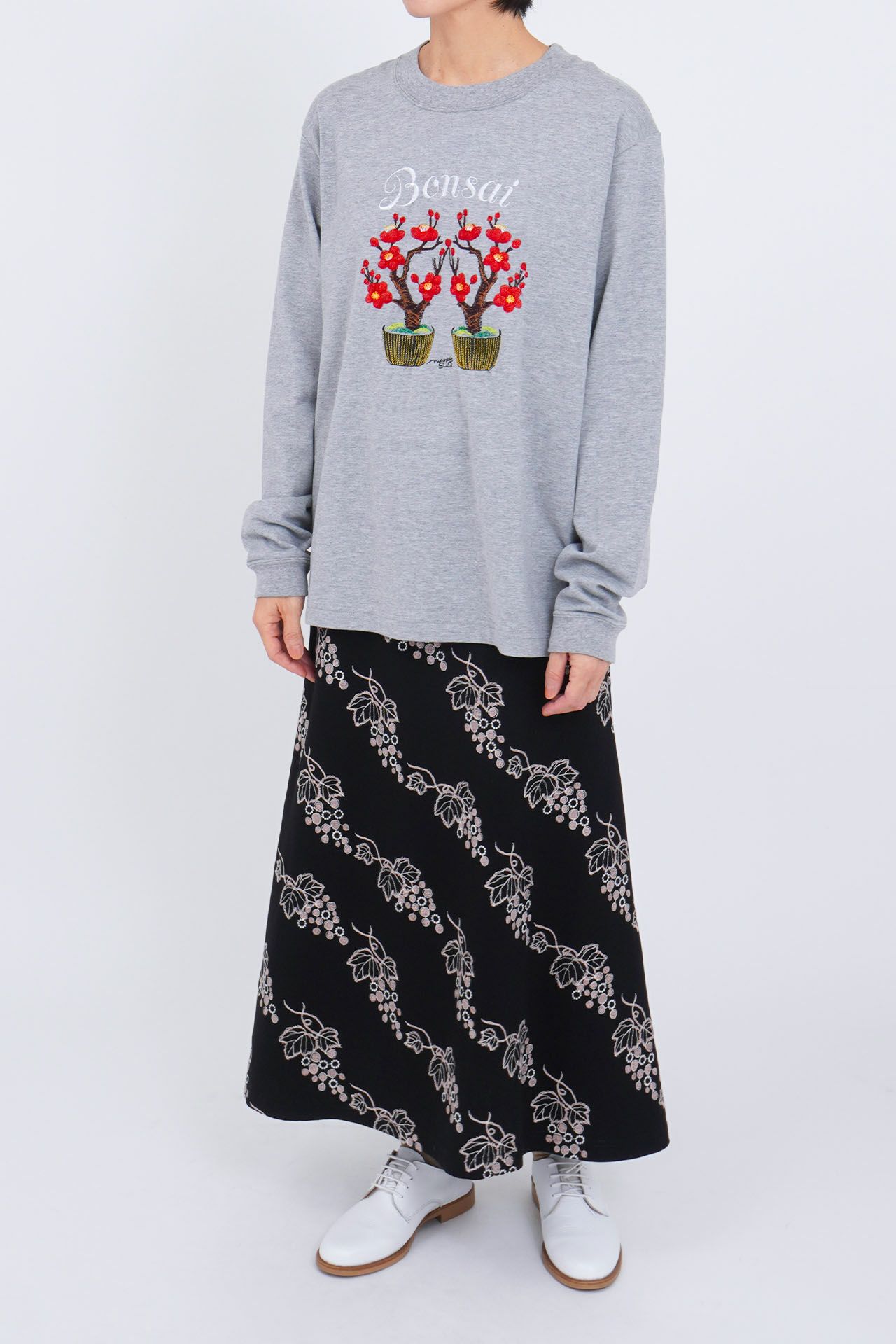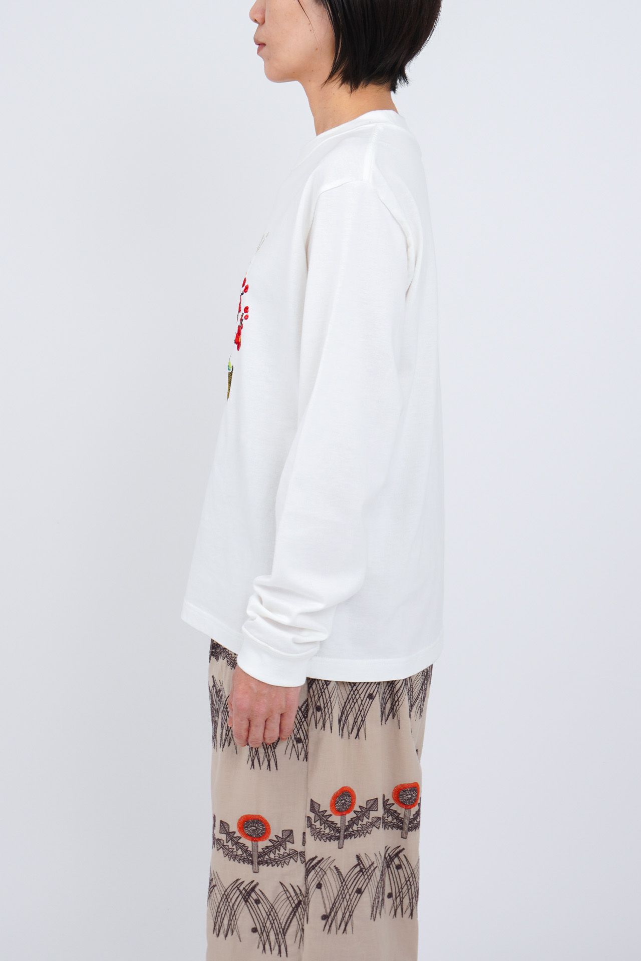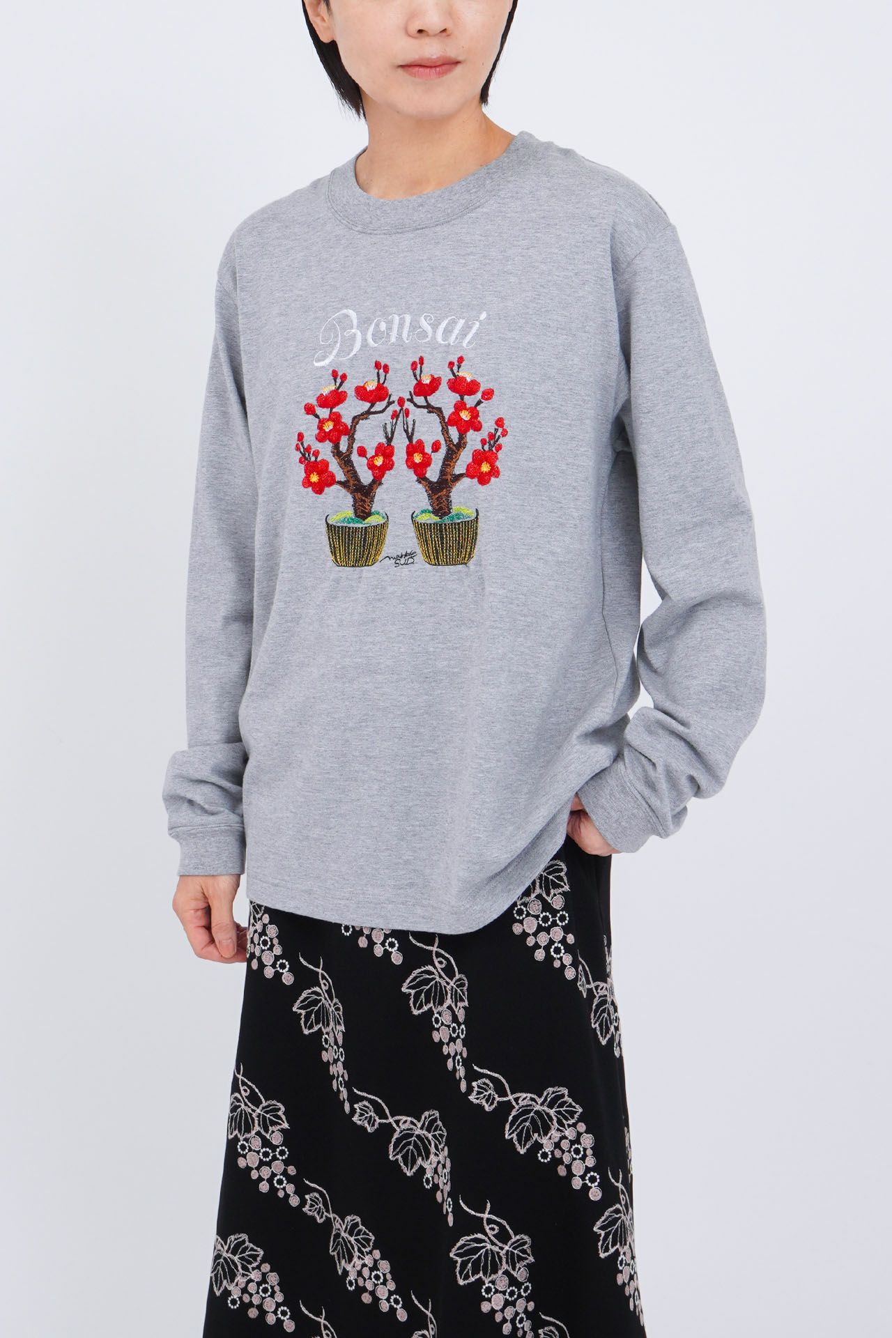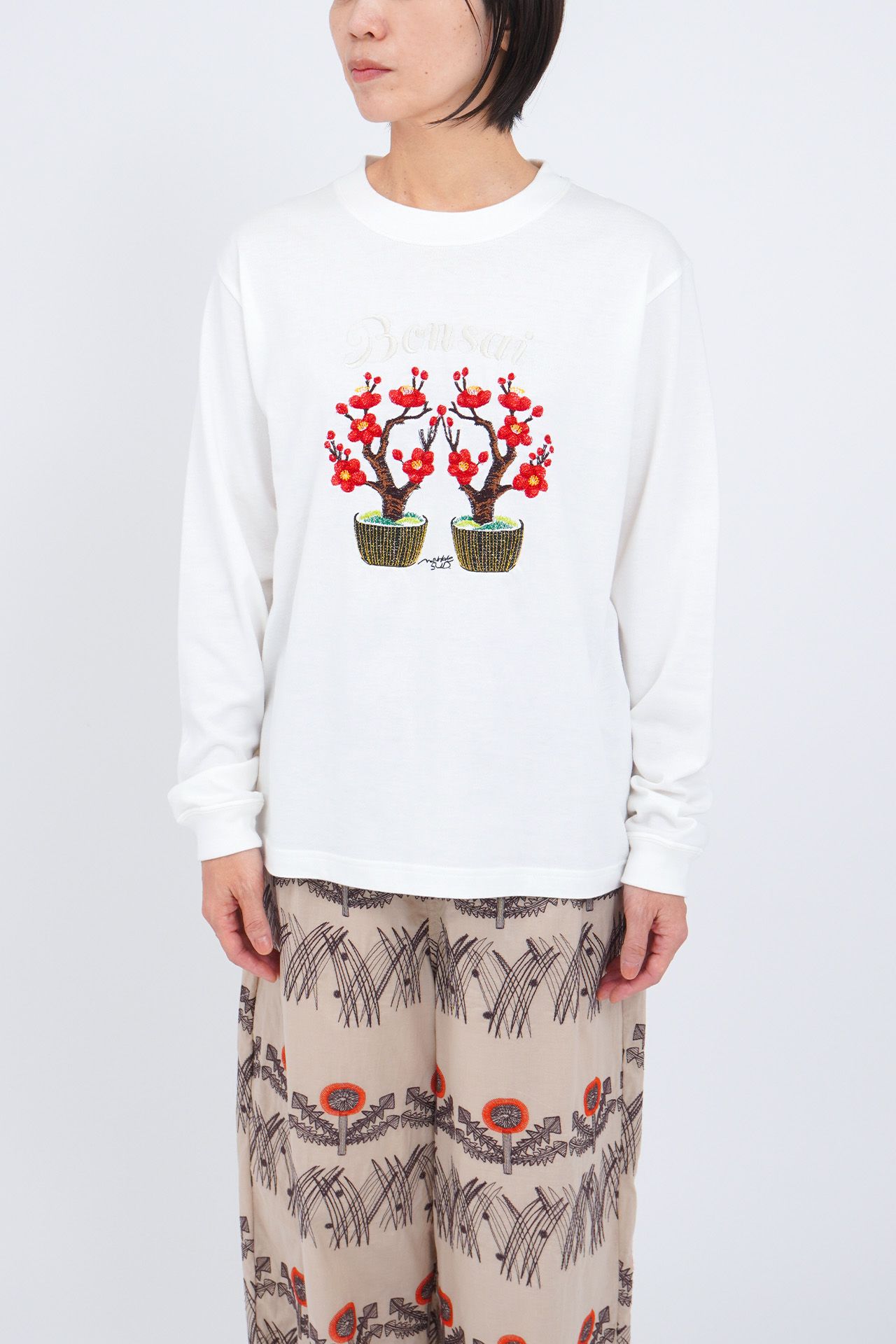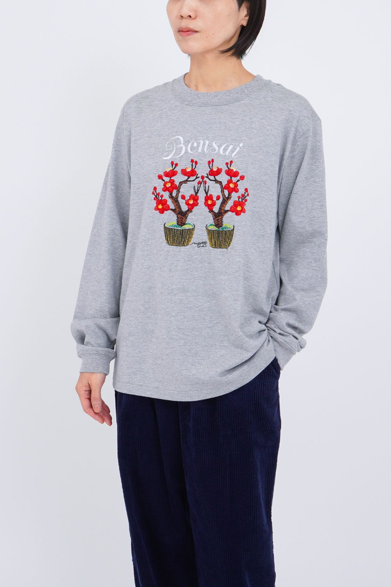 鮮やかに咲き誇る梅の花がアクセントになるロングスリーブTEE。1枚着はもちろん、羽織りもののインナーや重ね着にも活躍します。ゆったりとしたサイズ感の長袖Tシャツは、大人のカジュアルスタイルにマストな一着です。