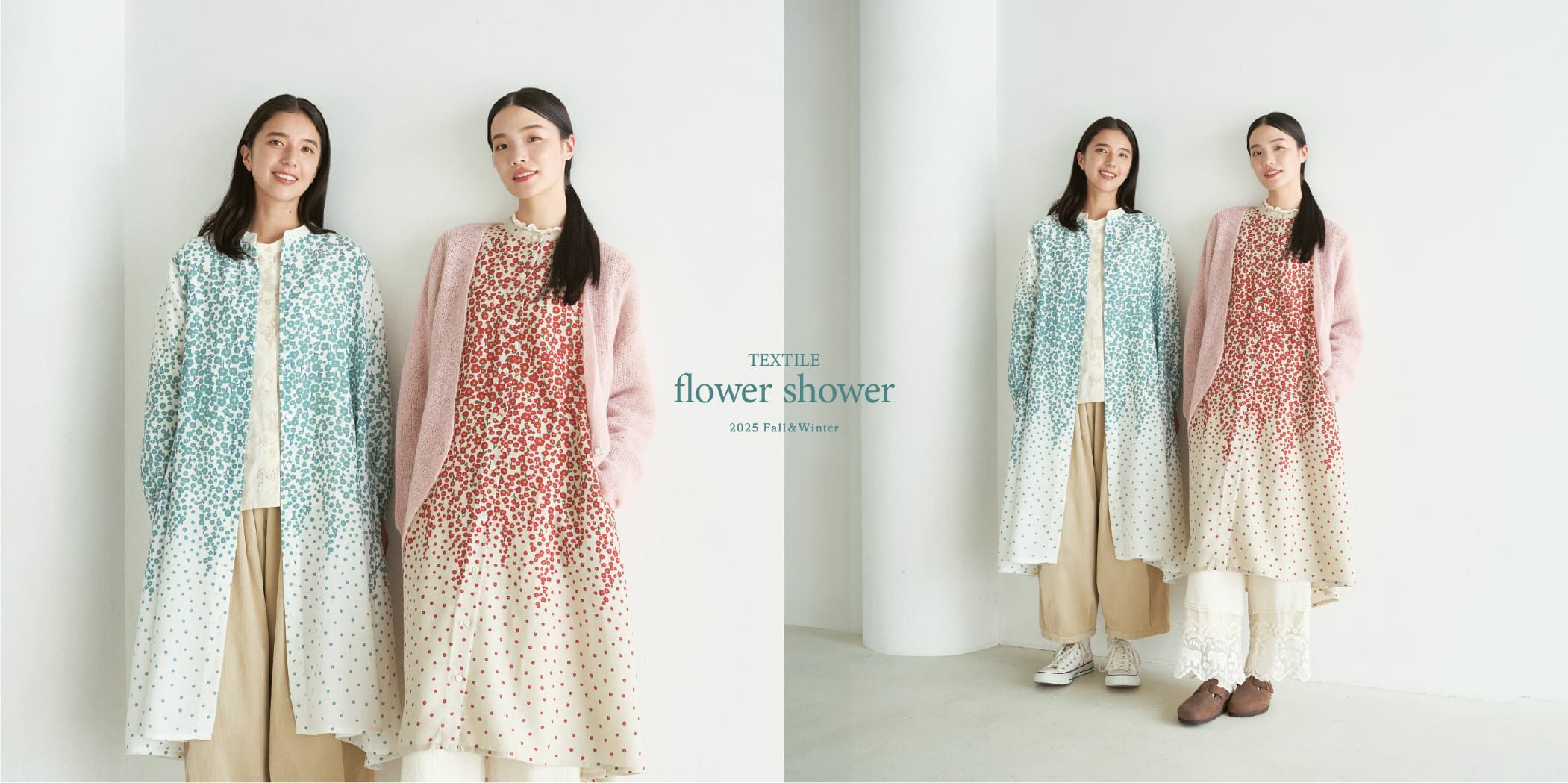 どこかレトロでかわいい色合いのちいさなお花たちがグラデーションになって降り注いでいる、ユニークな小花柄のテキスタイル。起毛感と綺麗な落ち感のあるウール混素材を使っています。