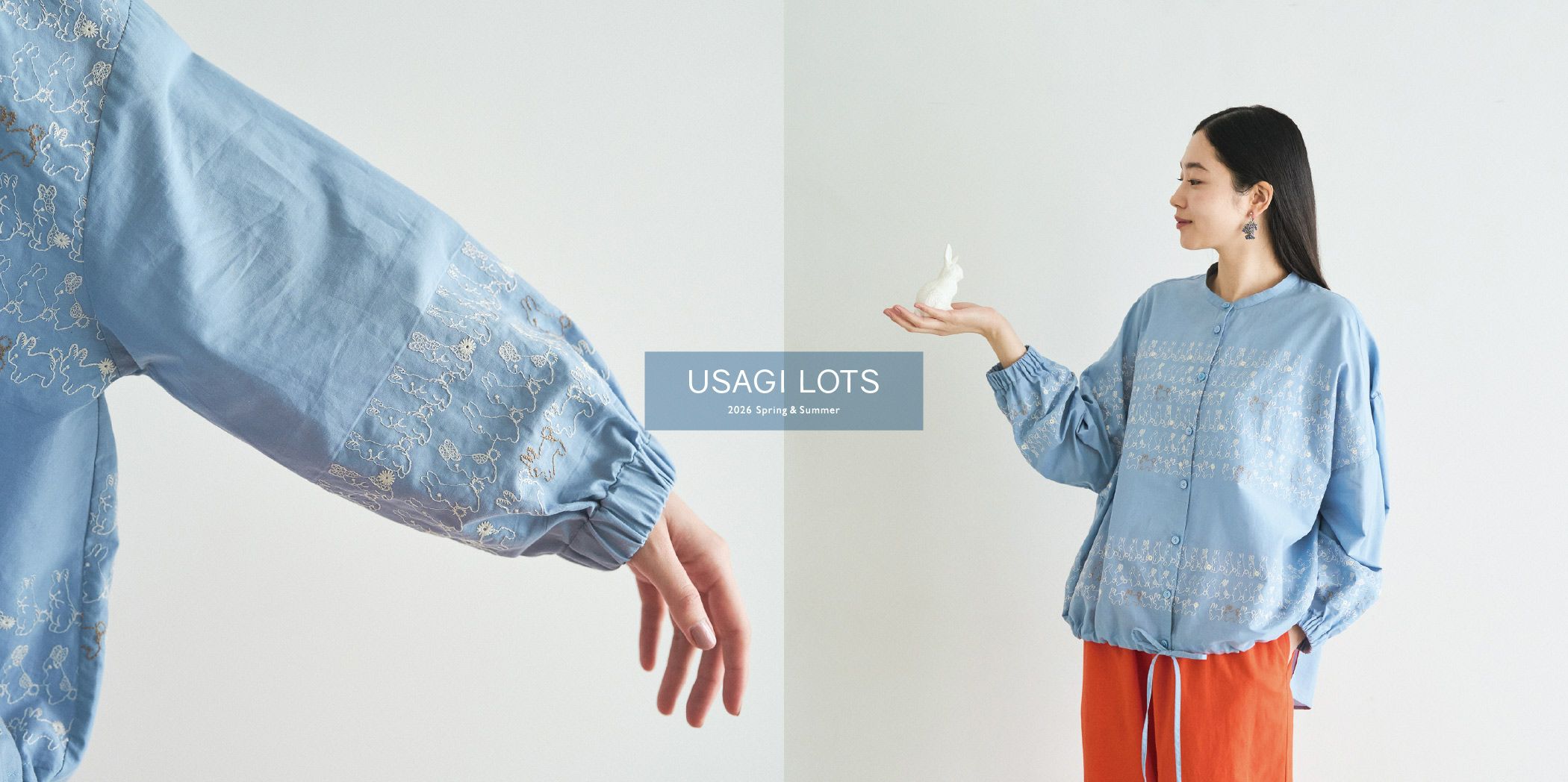 ふわふわしっぽの小さなうさぎたちがお行儀よく整列しているテキスタイル。可愛らしいモチーフでも部分的に使用することで大人っぽく仕上げました。 軽くて色鮮やかなコットンです。